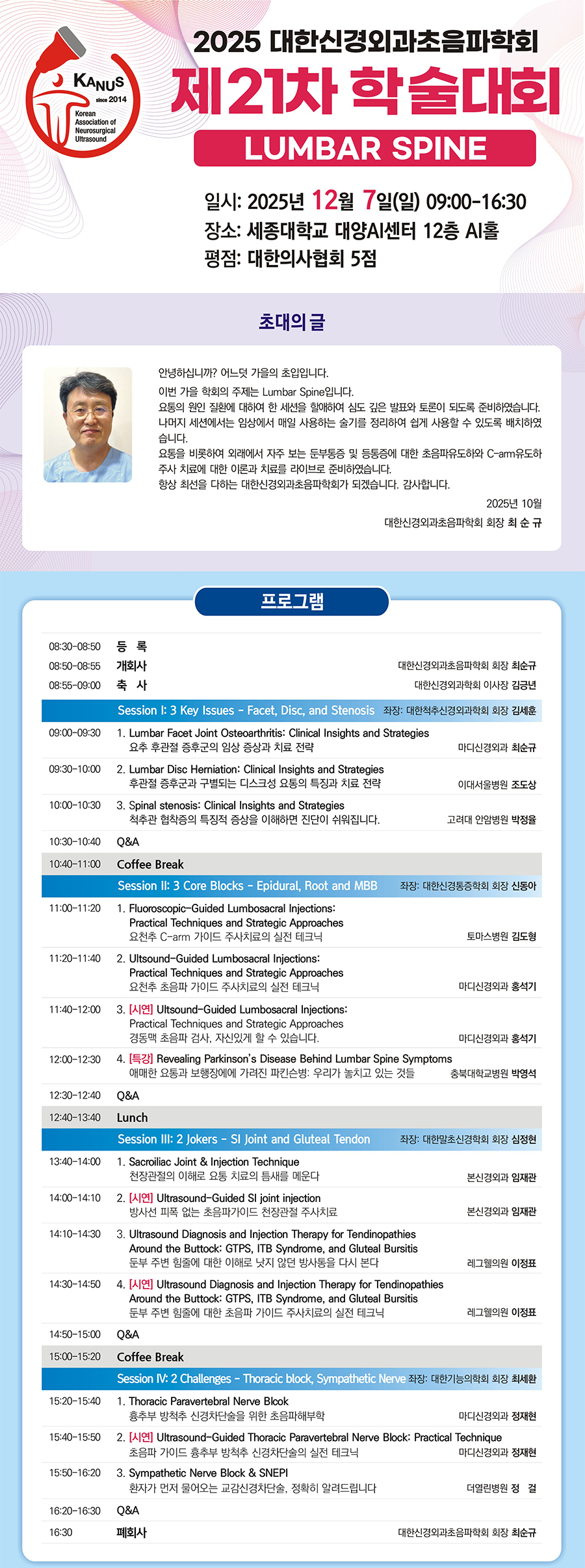 [사전등록중] 2025 대한신경외과초음파학회 제21차 학술대회 (행사일: 12/7, 일)