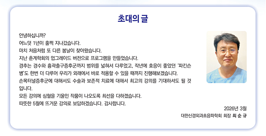 | 등록비용 | 개원의,봉직의 - 30,000원 / 종신회원 - 10,000원 / 공보의 - 10,000원 / 군의관 - 10,000원 / 간호사 - 10,000원 / 신경외과 전공의무료(선착순30명) - 0원 / 대한신경외과학회 원로회원 - 0원 |